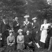 Glassplaten er skannet og behandlet av Fotohuset, Drammen. Venner på skogtur. Fra v. bak Gulbrand Gulbrandsen, Gustav Gulbrandsen, Haldis Gulbrandsen (Gustavs kone), Ingeborg Gulbrandsen (Gulbrands søster), Anna (mor til Arthur Gundersen), Arnt Aaserud. Foran fra venstre, nr 2 er Inga Aaserud (Arnts søster) nr. 3 Kaplan -