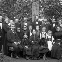 Glassplaten er skannet og behandlet av Fotohuset, Drammen. Pedersen bodde i Stasjonssgt og drev talestasjon før telefonen ble almindelig. I Bakerse rekke fra v : 1. Olaf Pedersen 2. Linken m/ barn 3. Carl Pedersen 6. Johan Pedersen 7. Hjalmar Pedersen 8. Fru Hjalmar Pedersen med Erling. Aleksander Pedersen er en av de som sitter. Han reiste til U.S.A.