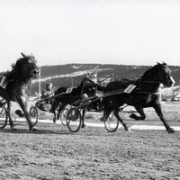 Rebergsteggi nr. 6 med Anne Marit Ludvigsen, Drammen i sulkyen vant, Monna nr. 8 med kusk Torill Aaserud, Skoger ble nr. 2. Navnet på hest nr. 5 og kusken er ute av minnet desverre. -