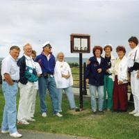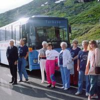 Sangkoret på utflukt en gang på 1980-tallet. Fra venstre: Knut Knutsen, sjaføren, Egil Larsen, Arnlaug Ebbestad, Kirsten ?, Gerda Johansen, Karin Eek Iversen, Synnøve Furustad, ukjent