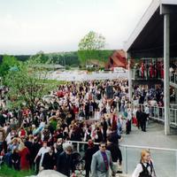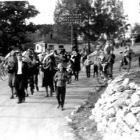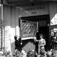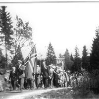 Konnerud Mannskor. 17 mai. Knut Løvås som flaggbærer. Hauanveien. Toget gikk den gang fra Konnerud skole om Gramsborg- Bernås- Bekkedalen-Skalstad og tilbake til skolen.