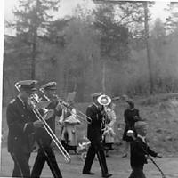 Musikorpset kom på en lastebil opp til Stubberud for å spille inn 17. mai. Nils Blixrud, Age Ravn- Hansen, Oddvar Warhus, Thorbjørn Tollefsen, Egil Kristensen, Finn Andresen, Kåre Gullhaugen, Helge Bliksrud og med ryggen til fotograffen : Egil Torgersen I bakgrunnen huset til Oscar Stubberud