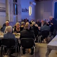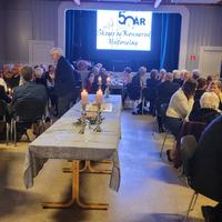 Skoger og Konnerud Historielag 50 år. Jubileumsfest på Skogvang 1. mars 2025. Kavalkade over historielagets mange komitéer og virksomhet. Kavalkaden er skrevet av Per Runar Thoresen og han fremførte den selv som innledning til jubileumsfesten iført sin vekteruniform.
