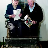 Olaf Rustand (til venstre) og Nils Otto Larsen viser fram hvert sitt eksemplar av Historilagsnytt. Bildet er tatt i 2006 da Historilagsnytt var 25 år. Olaf Rustand holder den første utgaven (som kom ut julen 1982) som var ført i pennen av ham i egenskap av Historielagets sekretær. Nils Otto Larsen var formann i 1982.
