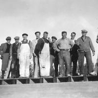Arbeidslag som satte opp et hus på en dag. Fra v.: u. Ragnvald Larsen. Martinius Larsen. Rolf Bjerkeseth ( Larsen). Johan Kristiansen ( Veibrekk) . Gunnvald Larsen. Harald Larsen. Thorleif Larsen. Alfred Larsen. (Gamle mureren) Arne Bjerkseth ( Larsen )