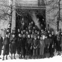 • Vi tror bildet er tatt foran Stordammen Pensjonat.. På høyre flanke står 2 gutter med "Birrger Ruud" lue og like selbuvotter. Den yngste foran er Torstein Bjerkeseth f. 1924 og bak han Arne Georg Bjerkeseth f. 1922. Etter alder å dømme på guttene kan bildet være tatt like før 2. verdenskrig.