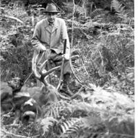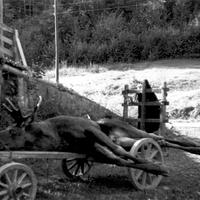 Tomas Løkka (1889-1971) inspiserer elgen v/ låvebrua Nedre Andorsrud
