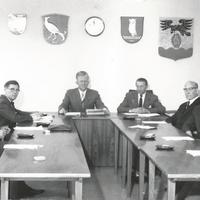 Det siste formannskap i Skoger kommune før sammenslåingen med Drammen 1.1.1964 Redaksjonen ber om bistand/korreksjon på manglende navn og ev. feil.. Fra V: Ingolf Hansen (Kommunistene), Svenda Friise (AP), Rolf Olsen (AP), Tollef Underberg (AP), Varaordfører Wilhelm Swach (AP), Ordfører Einar Mortensen (AP), Rådmann Rolf Stahl, Aarstein Fjeld (Høyre), Odd Marheim (Høyre), Egil Eskerud (Høyre) Torbjørn Andresen (KRF), Harald Engelkor (AP)