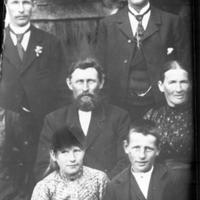 Fam. bodde i Nedre Eikerv. nr. 13. Fra v: bakerst Ole f. 1875, d. 1952 og Hans Marinius f. 1879, d. 1961. I midten : Oluf Olsen f. 1849, d. 1905, tømmer - annammer, og hans kone Maren Sofie f. 17.03.1853, født Grinda, fra Grinda, Saasen, Vestfossen. se bilde ID 402. Fra v. nederst: Margrethe Sofie, f. 1890, d. 1957. Hun var oldfrue på Drammen Sykehus, og Otto Ivar Borge f. 1888, d. 1956. Nedre Eikerv. 13, Schartim - gården, Strømsgodsets eldste skole, en av landets eldste skolebygninger. Det var Strømsfjerdingen skole.