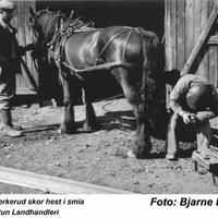 Smed Smerkerud skor hest ved Heimtun Landhandeleri Skoing av hest ved Heimtun (Fagerheim) i 1948. Smeden som holder hestens høyre bakfot mellom knærne mens han jobber med tilpasning av ny sko, er Olaus Smerkerud (1899 - 1977). Hvem som holder hesten, er vi usikre på. Smeden ble bestilt til gårdene, eller hesten ble tatt med til smeden, når det var nødvendig å få ordnet med hestens skoning. Bildet er tatt av Bjarne Eriksen som drev Heimtun Landhandel.