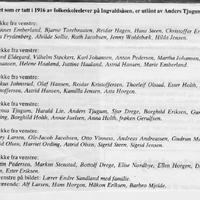 Navnene er: 1. rekke fra venstre: Johannes Emberland, Bjarne Torebraaten, Reidar Hagen, Hans Steen, Christoffer Eriksen, Frida Frydenberg, Alvilde Sollie, Ruth Jacobsen, Jenny Woldsbæk, Hilda Jensen. 2. rekke fra venstre: Sigurd Eldegard, Vilhelm Støckert, Karl Johansen, Anton Pedersen, Martha Johansen, Anna Bomansen, Helene Haaland, Justine Haaland, Astrid Hansen, Marie Emberland. 3. rekke fra venstre: Markus Johnsrud, Olaf Hansen, Reidar Kristoffersen, Thorleif Olstad, Ester Holth, Judith Kristoffersen, Astrid Hansen, Kamilla Jensen, Asta Horgen. 4. rekke fra venstre: Magnus Tjugum, Harald Lie, Anders Tjugum, Sjur Drege, Borghild Eriksen, Gunnlaug Ording, Borghild Holth, Annie Juelsen, Anna Holth, frøken Gerulfsen. 5. rekke fra venstre: Henry Larsen, Ole-Jacob Jacobsen, Otto Vinness, Andreas Andreassen, Gudrun Mæland, Sigrid Olsen, Harriet Ording, Astrid Olsen, Sigrid Steen, Sigrid Jensen. 6. rekke fra venstre: Martin Pedersen, Markus Stenstad, Bottolf Drege, Elise Nordbye, Ellen Horgen, Dorthea Steen, Ester Eriksen. Ytterst til venstre lærer Endre Sandland m/familie.