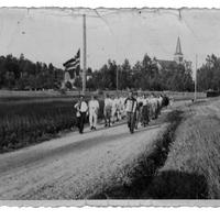 Med flagg og trekkspillmusikk masjerer representanter for Skoger idrettslag (antakelig håndballldamene) til stevne på Sletta. Toget er anført av Markus Johnsrud med trekkspill og Olaf Haveraaen som flaggbærer. Sletta i Skoger ble åpnet 27. juli 1947 etter en stor dugnadsinnsats over lang tid. Simen Horgen foreviget en del av dugnaden og åpningen på film. Filmen er nå i Skoger og Konnerud Historielags arkiv. Den er digitalisert og tilgjengelig på nettet. Medlemmer i historielaget som ønsker å se filmen kan ta kontakt på e-post, foto@skhist.no, for å få tilsendt lenke til filmen. Skoger og Konnerud Historielag takker Inger Johnsrud for opplysninger om bildet. Hun skriver: "Jeg tror det er Skoger Idrettslag på vei til idrettsstevne på Sletta. Trekkspilleren er jeg temmelig sikker på er min far, og jeg synes flaggbæreren ligner onkel Olaf, dvs Olaf Haveråen. Bildet kommer opprinnelig fra Steinar Lunda senior, og alle disse var ivrige i idrettslaget i Skoger. Tror faren min kanskje var formann på denne tida, uten at jeg har tatt meg tid til å sjekke dette. Han var iallfall leder for opparbeidelsen av Sletta sommeren 1945. Tidsbestemmelsen på bildet kan være riktig." Etter at Inger har sett filmen meddeler hun følgende: "Siden datoen for filmingen kom opp, var det raskt å slå opp i dagboka til faren min, hvor det står om innvielsen at det var flott vær, og at ca 1000 mennesker hadde møtt fram! Det står også at han hadde vært leder for arbeidet på Sletta i de 10 årene(!) de hadde jobbet med anlegget. Litt av en jobb da, men det gikk vel i perioder mellom onnene, pluss antakelig en del forberedende arbeid." -