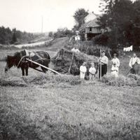 Sigurd Stubberud med høylass. Arvid sitter rett bak han. Til v. på bildet ser en huset til Henry Stubberud