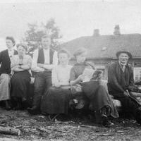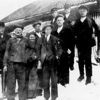 Fra v.i fremste rekke Kolbjørn Rolig, Oluf Kinnerud.hans hustru Karoline . Halvor Grinderud. Kinnerud ? Sverre Kinnerud. De tre i bakre rekke er pr. dags dato ukjente. O.H.