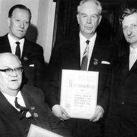 Foran: Axel M. Amundsen (1899-1970). Bak fra v: Arne Larsen, Rolf Pettersvold (1912-1981 )og Oskar Mortensen (1922-1996). Amundsen og Pettersvold ble utnevnt til æresmedlemmer og Arne Larsen ble tildelt KIL`s hederstegn. Oskar Mortensen var formann i KIL.