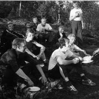 Dugnadsgjengen har en pause under arbeidet med å gjøre løypene klare til NM i 1978.