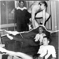 Hans Haveraaen var instruktør på et mosjonssparti som ble drev et i regi av eldres avdeling i KIL Han ser her på Arvid Sanders som hopper på bukk. Under i forgrunn Elling Eskerud, bak Kåre Arntsen trimmen var i gymsalen på Konneud skole.