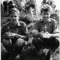 Unge orienteringsløpere. Til venstre Thor Mortensen f. 1943 og Rolf Levin Jensen f. 1945. I et orienteringsløp på Kongsberg i 1959 vant Thor eldste gutteklasse. Rolf vant yngste gutteklasse. Premien som de sitter med i hendene er en bergmann med en liten sølvklump.