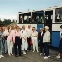Konnerud sangkor på tur til Tuna Korsång på Røros. Fra v.: Torunn Ask Olsen, ?,Arild Ødegård, ?, Mona ?, Johnny Karlsen, Einar Borgan, Gerd Lund, Karin Eek Iversen, Per Hellerud, Eli Hellerud, kona til Egil Larssen, Arnlaug Ebbestad, Jorunn Larsen og Kirsten Tellnes Svere.