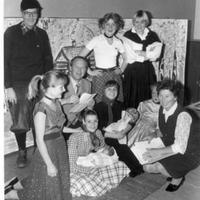 På 50 års jubileet i 1977 laget man revyen "Klokken er slagen" Tekst av Jan Bernhof Michelsen, sketsjene og visene av Goro Halden. Revyen var spunnet rundt handlinger i lokalmiljøet, og Helge Dammen ledet an blant aktørene på senen. På bildet til høyre sitter på huk Goro Halden. Mellom barna skimtes Jan Bernhof Micelsen. Bak stående : Bjørn Ask Henriksen som dro lagets historie på rim. Revyen samlet 3 fulle hus - 800 tilskuere i gymsalen på Konnerud Skole.