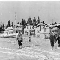 Hotellgjestene på skitur foran hotellet. Konnerud Sanatorium ble bygget på gården Eskerud i 1896. Byggherre var: Grosserene Brecke, Rudolp og Andersen. Senere overtatt av hotelleier Jens Henriksen fra Tønsberg som utvidet til hotell. Etter første verdenskrig omdøpt til Konnerudkollen Turisthotell, drift til ca. 1940. Etter krigen ble hotellet benyttet som en underavdeling av Univerisitet i Oslo for 107 norske kostholdsstudenter som studerte engelsk over to semestre. De bodde på hotellet sammen med sine lærere. Denne form for college var en ny form for universitet i Norge. Kort varighet, fordi hotellet ble solgt til Europahjelpen i 1949 som mottaksstasjon for flyktninger .Siden brukt til kursted. Hotellet ble ombygd til det ugjenkjennelige i 1950. Staten overtok hotellet vedrlagsfritt i 1951 og det ble brukt som en underavd. til Lier sykehus i 1956. Hotellet brant sommeren 1967.