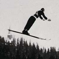 Jacon Tullin Thams i svevet i Holmenkollen 1928. Han vant NM i Konnerudkollen i 1926 og var Olympisk mester i 1924 og verdensmester senere. Tekst: Per Runar Thoresen
