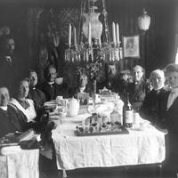 Lok.fører Andreas Nilsen Skarra, Langum f. 10.04.1859 Vestfossen d. 1935 på Langum Fru Julie Regine Sophie, f Clausen f. 13.09.1860, d 15.05.1945. Billedet er tatt i stuen på Langum. Bildet står i Skogerboka. -