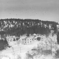 Til v. Bjørnerud og Engeland Midt på Peder Berntsen Bak til høyre Gustav Emberland. til h. Georg Emberland. Dette er hus som ligger rett bak Skoger kirke. Vi ser litt av kirken til høyre i forgrunn.