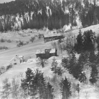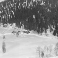 Bråthen i Mælen i forgrunn. Låven er på Hjellum. Gården Hjellum er revet. Den lå helt innerst i Mælen. I lia bak var det en liten hoppbakke, Hjellumbakken. Kunne hoppe 30-40 meter.