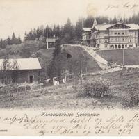 Postkort fra Konnerudkollen Turisthotell som på denne tiden ble drevet som et sanatorium. Bildet tatt på begynnelsen av 1900-tallet fra "Sundlandsvingen". Til venstre ser vi hotellets bad/vaskeri ved bekken som fortsatt renner forbi stedet. Kortet er sendt 9. desember 1903 til mottaker i Tyskland. (Se alternativt bilde- baksiden av kortet). Mer omtale av hotellet på bilde nr 43. Mer omtale av hotellet på bilde nr,. 43