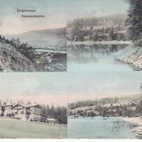 Bilde av Konnerudkollen Turisthotell som på denne tiden ble drevet som et Sanatorium. 4-delt bilde hvor biten øverst til venstre er tatt fra gruveområdet ned mot Drammenselva. De to til høyre er tatt fra Stordammen mot hotellet. Du finner mer omtale av hotellet på bilde nr 43.