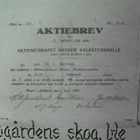 Aksjebrev i Skoger Kalkstensmølle som lå ved siden av (mot vest) der Skjeldrumsaga nå ligger. Motoren fra kalkstensmølla ble brukt som motor for saga etter flyttingen av saga.