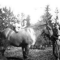 Det er Asta Johansen som holder sin lille sønn Kjell på hesteryggen. Han som holder hesten, er Gunnar Bjørnerud. Asta var gift ned Arthur Johansen, bror til Emil (far til fotografen Anne Berit Johansen). Asta og Arthur bodde i Sandbråten Sandbråten ligger nede ved Bremsa. Kjører forbi Westbye (ikke langt fra Skoger gamle kirke) for å komme dit.