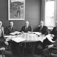 Tekst: Per Runar Thoresen Fra V : Hans Steen, Håkon Fossen, Styreleder Egil Eskerud, Banksjef Hans Skjeldrum, Markus Johnsrud, Rolf Olsen, Slakter Aksel Einar Andersen