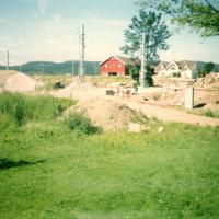 Arbeide i forbindelse med den nye motorveien ved Skoger stasjon som lå i bakkant av bildet. Brua over motorveien og jernbanen ses i bakgrunn. Den ligger i Sande.