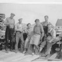 Bernås sag og høvleri. Fra v. - u - Erling Svensrud - Arvid Halvorsen - Arne Kaspersen ------- Sittende til h. klyvemester Willhelmsen