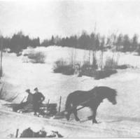 Anton og Henry Stubberud kjører tømmer med hest, Bildet er tatt fra stubberudveien 195 dt 2004