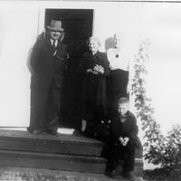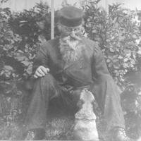 Anders J. Skalstad m/hunden hjemme i haven på Kristinelund. Dette bilde henger innrammet i stor format på Kristinelund. Det er en gave fra Bjørn Skalstad til Ørnulv Backe.Hans datter Synnøve Sandbekk har frert bildeet til Skoger Historielag, med annmodning om at det skal henges på Kristinelund -