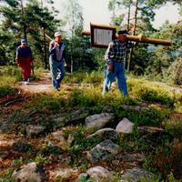 Disse tre, fra venstre: Kristoffer Halden, Helge Furuvold og Hans Halden eer på veg til å sette opp skiltet på "Jernaldergruve" på Tolerudåsen 28. juli 1998