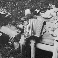 John Johnsrud var behjelpelig med transport under pensjonisforeningens utflukt. Sittende i skuffen fra venstre: Aud Beheim, Johs. Hagen, Marta Engeland. Bildet er tatt sommeren 1984.