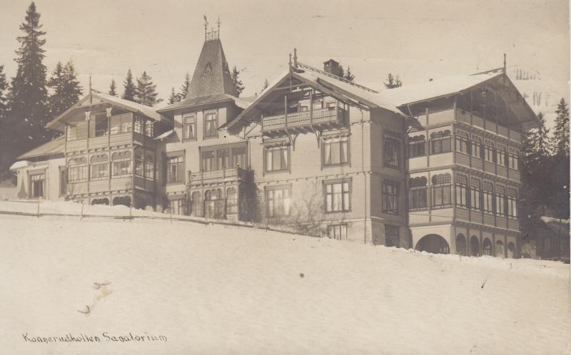 Vinterbilde av hotellet som i årene etter 1900 årskiftet ble drevet som et Sanatorium. Gjesten har sendt postkortet til Brevik 21, juni 1905.Gjesten skriver bl.a.at han skal være der utover sommeren og at han aldri har vært så høyt tidligere.Han får sund mat som Havregrøt med Flødemelk. Antakelig ar gjesten dansk. Mer omtale av hotellet på bilde nr. 43.