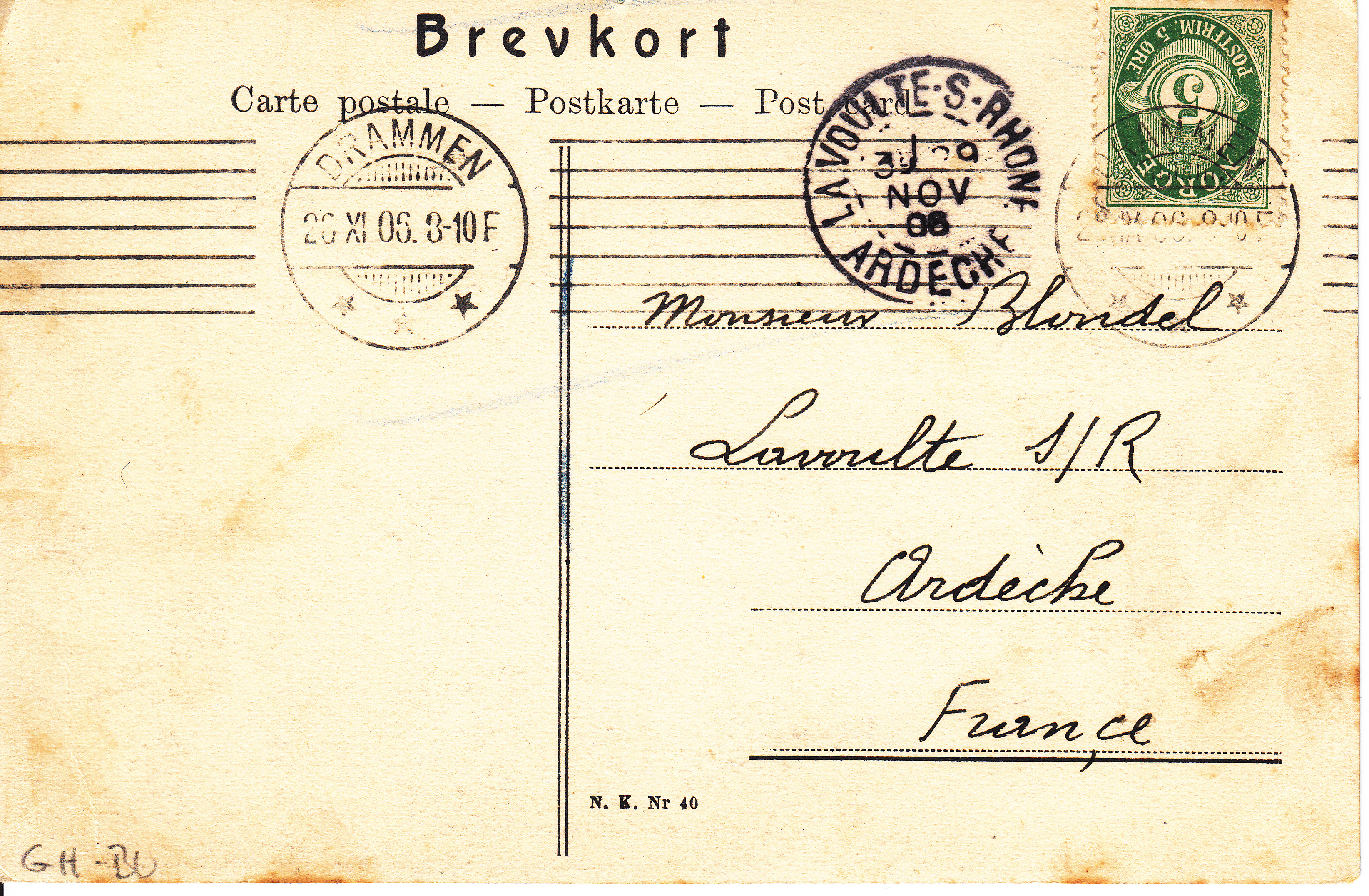 Kortet utlånt av Tor Alf KristiansenPostkort sendt til mottaker i Frankrike 1906Se alternativt bilde.Tekst: Per Runar Thoresen. Postkortet er en del av en samling som ble kjøpt av Skoger og Konnerud Historielag i januar 2017.