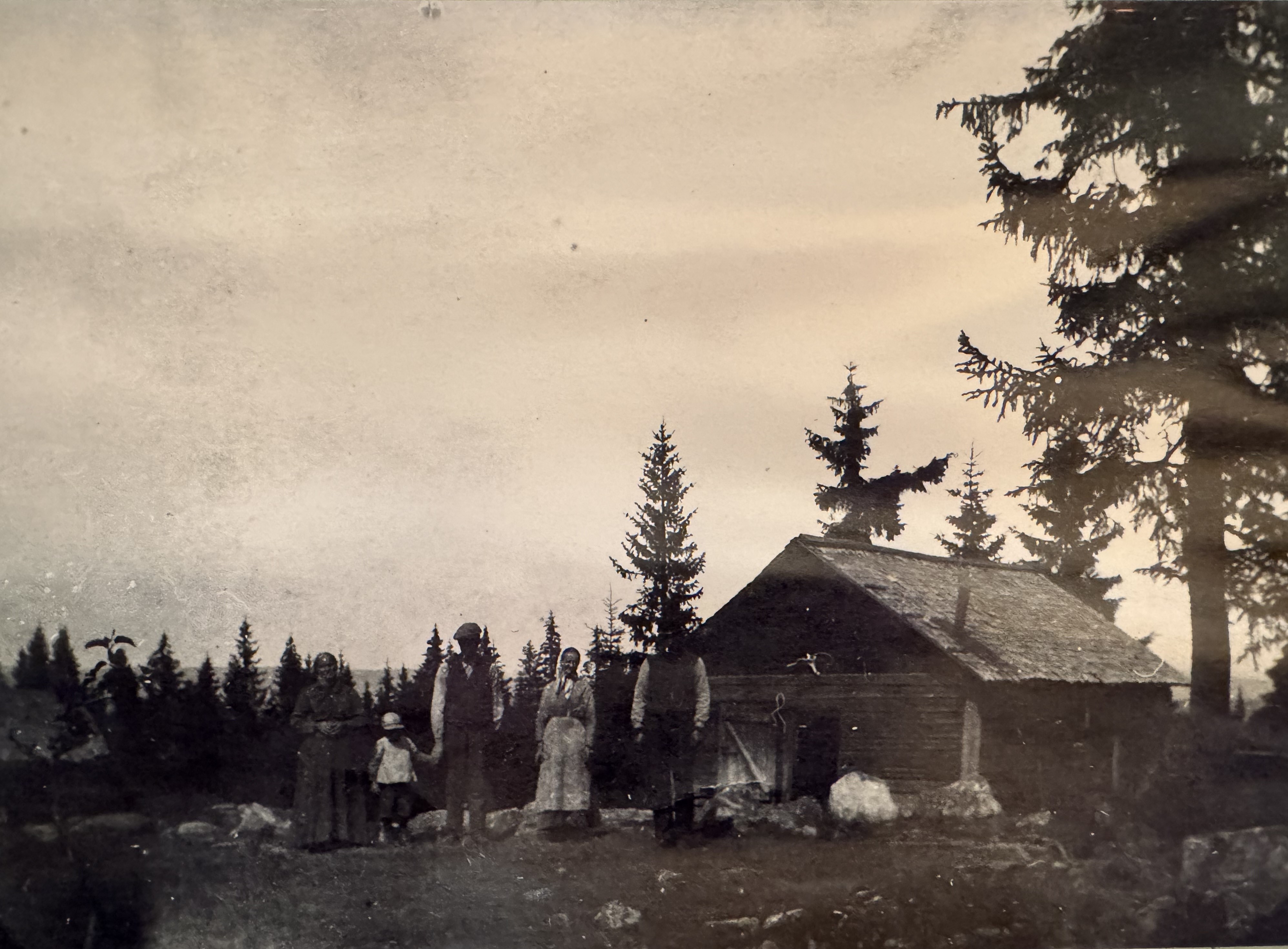 Dette fotoet er tatt på Bjørgesetra på Vestskauen. Fotoet er tatt ca 1920 og av fotografen er Olaf Bøhlum. Fra venstre: Jørgine Bjørge, Johan Bjørge, Nils Bjørge, Netta Gravdal (1865-1941), Ola Larsen. Disse bildene henger i stua til Netta Gravdal på Bjørgesetra og Ivar Bjørge viste dem for meg.