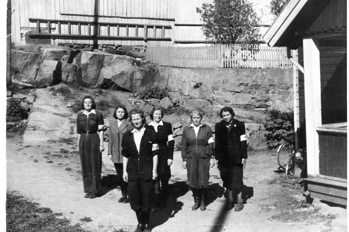 Foran Sigrid Wiborg Andersen, lagleder for kurer og sambandstjenesten. Bak fra venstre Gerd Inger Johannessen (f. Nilsen), Mary Nordby (f. Reiersgaard), Åse Backer-Owe (f. Sjuve), Synnøve Haflan (f. Wang) og Henny Lehn (f. Gjertsen).