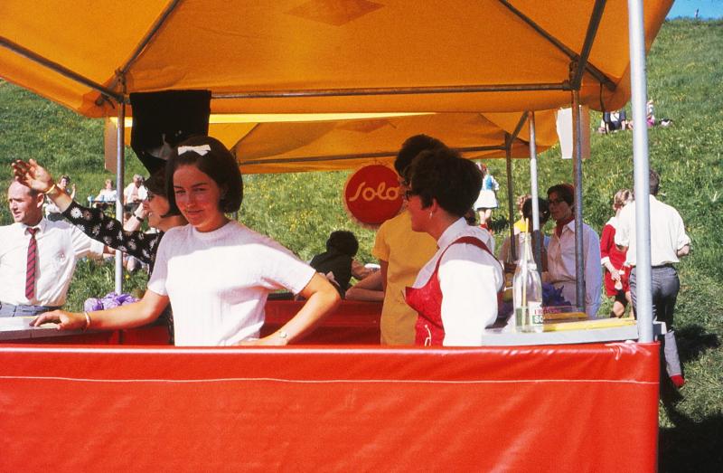 Bemanningen i en av salgsbodene på stevneplassen i 1969. Fra venstre: Bodil Knutsen (gift Bråthen), Inger Juel (gift Hoven), Jorunn Aaserud og Ellen Andersen (gift Juel).