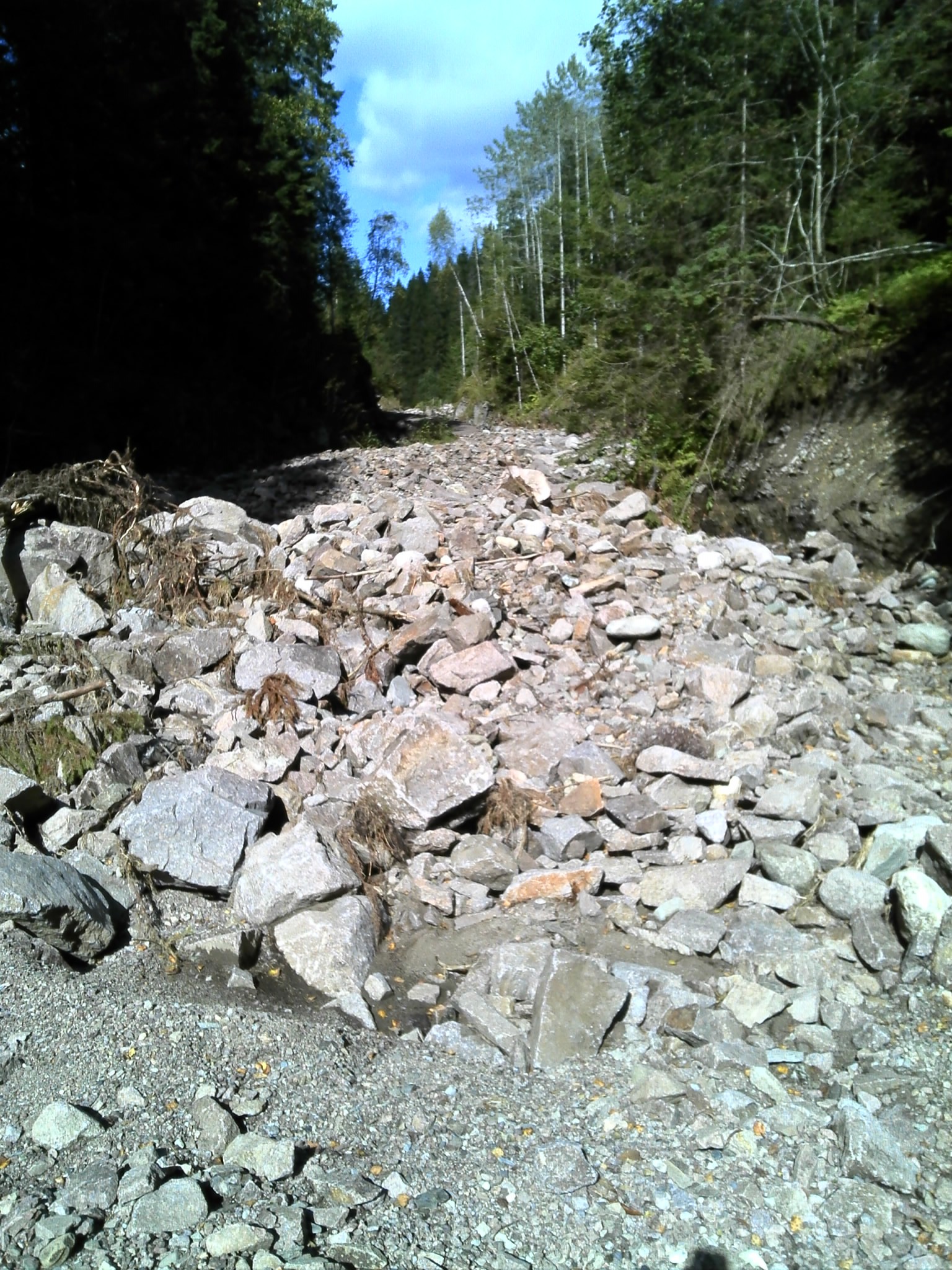 Uværet "Frida" som kom inn på ettermiddagen 6.8.2012 og herjet også natt til 7.8.2012, gjorde store skader i Eikerbygdene. På Vestskogen ble mange av skogsbilveiene til Selvik Bruk helt eller delvis ødelagt. Bildene viser hvordan det så ut oppover Katthusdalen etter "Frida". Skogsbilveien var for en stor del fullstendig rasert og erstattet av et eleveleie med store steiner.