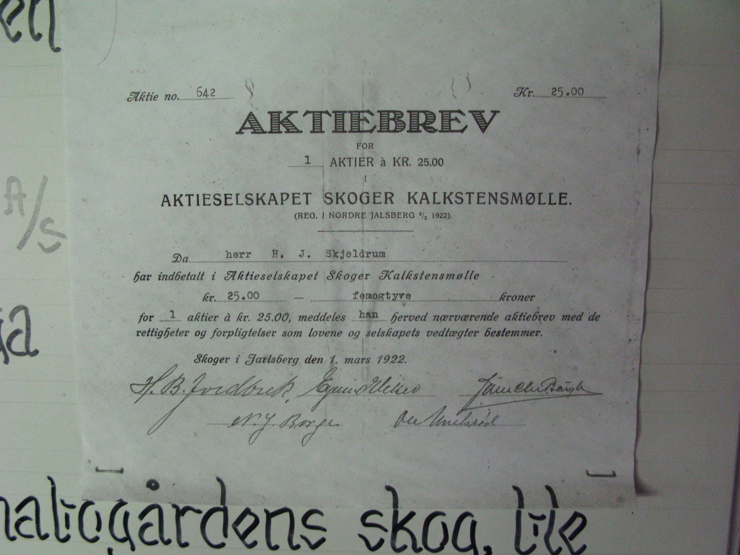 Aksjebrev i Skoger Kalkstensmølle som lå ved siden av (mot vest) der Skjeldrumsaga nå ligger. Motoren fra kalkstensmølla ble brukt som motor for saga etter flyttingen av saga.