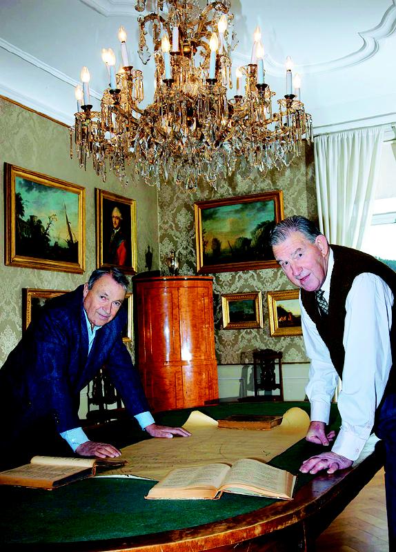 Tidligere herredsstyremedlemmer (Egil Eskerud (til venstre) og Alf Nordli) er tilbake på gamle tomter (Austad Hovedgård) der herredsstyret i Skoger var samlet frem til des.1963. Skoger kommune i Vestfold fylke ble slått sammen med Drammen kommune i Buskerud fylke fra 1. januar 1964.