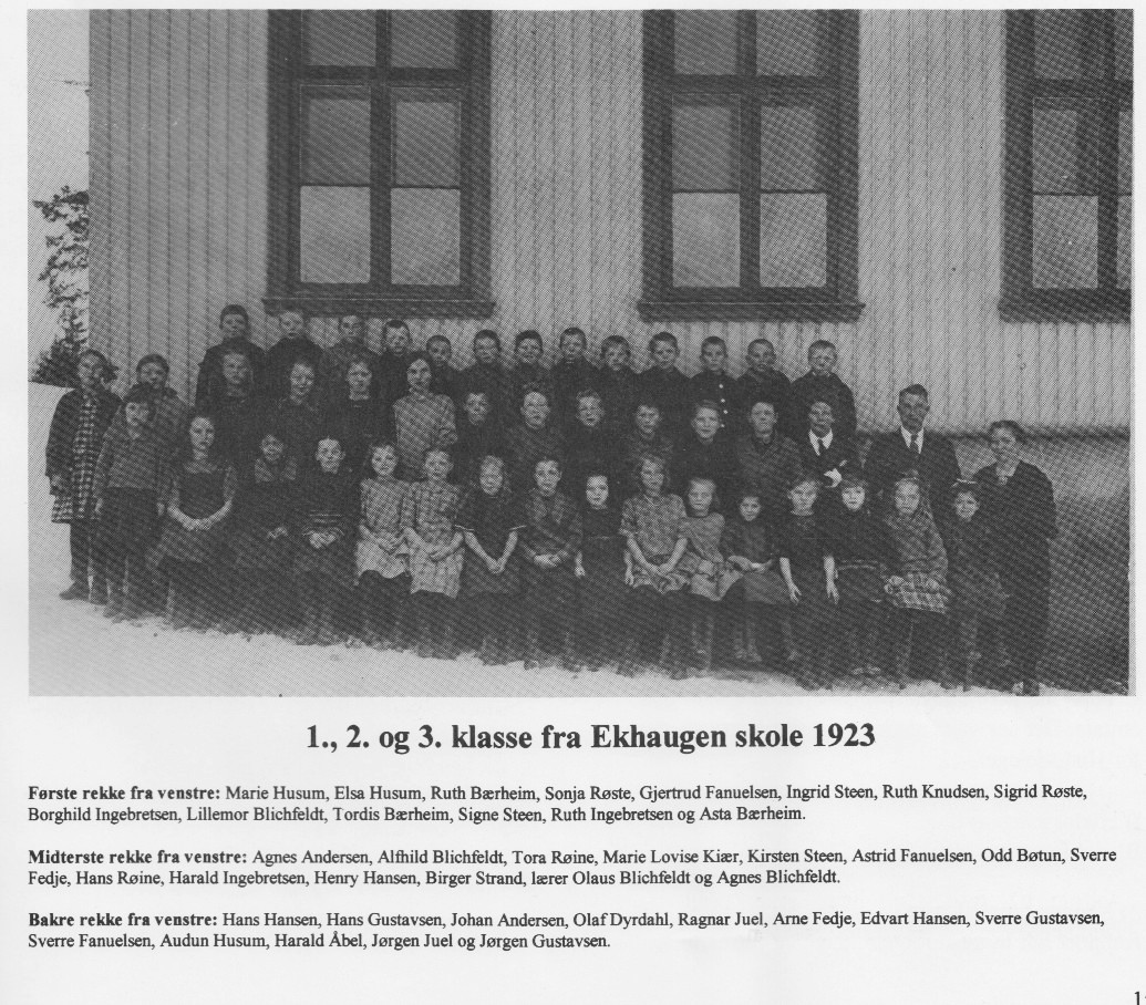 Første rekke fre vcnstre: Marie Husum, Elsa Husum, Ruth Bærheim, Sonja Røste, Gjertrud Fanuelsen, lngrid Steen, Ruth Knudsen, Sigrid Røste, Borghild Ingebretsen, Lillemor Blichfeldt, Tordis Bærheim, Signe Steen, Ruth Ingebretsen og Asta Bærheim. Midterste rekke fre venstre: Agnes Andersen, Æftrild Blichfeldt, Tora Røine, Marie Lovise Kiær. Kirsten Steen, Astrid Fanuelsen, Odd Bøtun, Sverre Fedje, Hans Røine, Harald Ingebretsen, Henry Hansen, Birger Strand, lærer Olaus Blichfeldt og Agnes Blicfeldt. Bakre rekke fra venstre: Hans Hansen, Hans Gustavsen, Johan Andersen, Olaf Dyrdahl, Ragnar Juel, Ame Fedje, Edvart Hansen, Sverre Gustavsen, Sverre Fanuelsen, Audun Husum, Harald AabeI, Jørgen Juel og Jørgen Gustavsen.