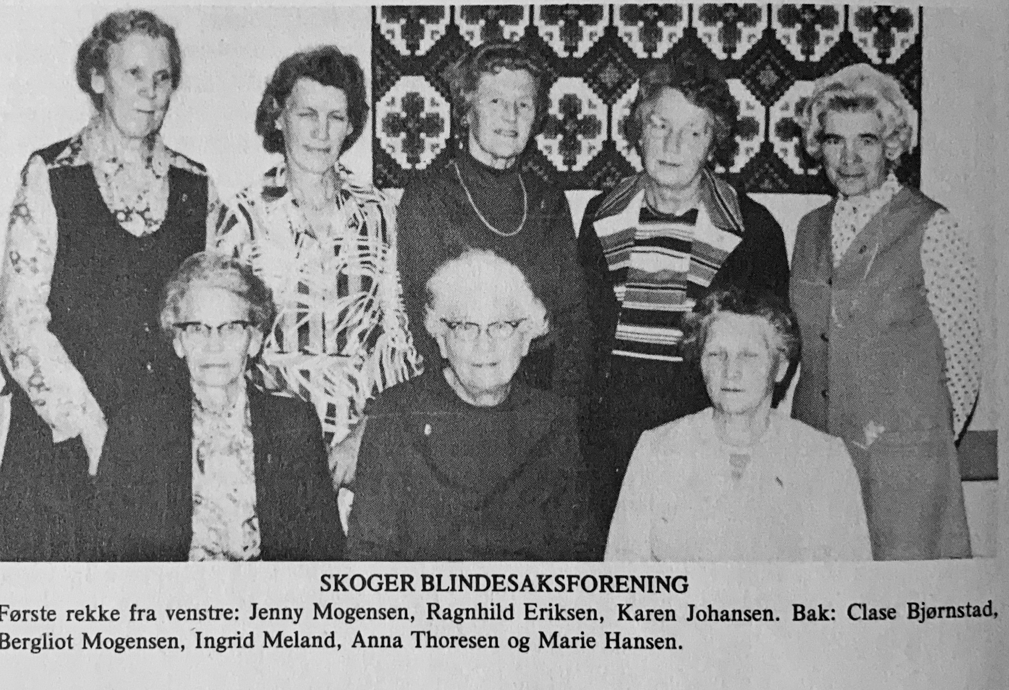 Tekst: Torill Juel, skannet fra Skauger Se mer i Skauger 1976 des. "Vil gjerne få sende Skauger et foto av 8 medlemmer i Skoger Blindesaksforening, som alle ble tildelt "Blindesaksnålen" under foreningens 40 års jubileum 2/2-1974. Det er Norges Blindeforbund som utdeler dette hederstegnet til medlemmer av blindesakslag som har virket aktivt for blindesaken i minst 20 år". D J